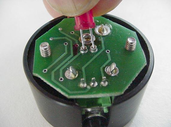 The LED cathode (flat side) is to the left in the figure. (If the LED does not light, try turning it around.) Best results are obtained if a blocking filter is placed in front of the camera to block the excitation light from the primary microscope. The blocking filter can be placed either in the filter cube (18mm Nikon old style cubes) or in the C-mount in front of the camera (25mm filters). The figures below show a blocking filter being placed in the C-mount and the C-mount/camera assembly being installed on the video microscope.
