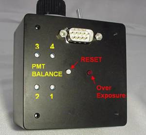 The quadrant PMT has built-in overexposure protection against unintentional non-repetitive exposure to bright light. A red light on the back panel indicates that the over-exposure circuit has tripped and that high voltage to the PMT has been turned off. Press the Reset button on the back panel to re-enable the high voltage. The overexposure circuit will usually trip when the PMT is first powered on.