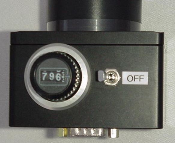 A ten-turn dial and toggle switch control the high-voltage (gain) to the PMT. The ten-turn dial gives proportional control of the HV to the PMT between 0-900V. The Hamamatsu PMT has a maximum voltage rating of 900V and a recommended working voltage of 800V, which would correspond to about 900 on the dial. Be especially careful about overexposure when running above 800V.