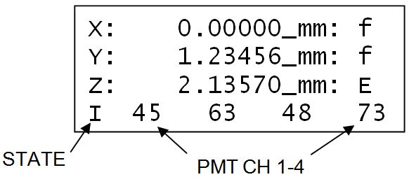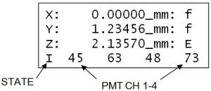 The meaning of the quantitative information on the display changes depending up on the system state. In the IDLE (I) state the display shows the raw signals from the four PMT channels. Switching to the MONITOR (M) state grabs the current levels as background and displays the background-corrected values on the LCD. When in the READY (R), PAUSE (P), CALIBRATE (C), BALANCE (B), or ERROR (E) states, the bottom line shows