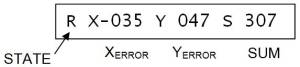 | READY | R | lock TRACKING | MONITOR | Saves Settings | Ready state – Display show Xerror, Yerror, & Sum. Short press of Joystick button will lock. |