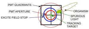 Tracking it is best accomplished when the tracked spot is well defined compared to background or other interfering optical signals. The PMT aperture and the excitation light field stop can aid in masking unwanted light from the PMT. The diagram at the right illustrates the situation where everything is mapped to the image plane. Stopping down the PMT aperture keeps the spurious light from getting to the PMT. Stopping down the excitation light keeps spurious fluorescence from interfering with the target object. Stops that are too tight will cause tracking difficulties with fast moving organisms. If the tracking target rapidly moves outside the aperture stops without the stage managing to keep up, the target will be lost. There is a compromise that must be determined to have robust tracking and good masking.