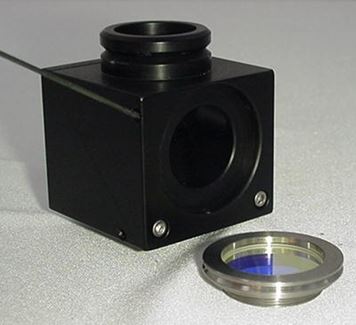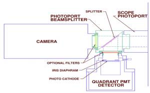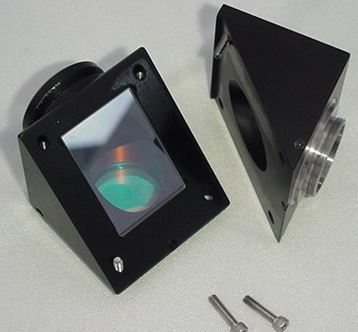 The PhotoTrack quadrant photomultiplier (PMT) is a C-mount device where the photo-cathode of the PMT is located at the C-mount image plane. The PMT may be attached to any microscope C-mount and be correctly positioned, however it is more common to interpose a photo-port beam splitter so that the instrument can be used with the data-recording camera. The ASI Photoport Beam Splitter works with most inverted microscopes to provide two direct C-mount ports at the microscopes design location. The splitter uses a 36.0 x 25.5 x 1.1 mm plate beam-splitter, which is the common size for most Zeiss filter cubes. Either partially silvered mirrors or dichroic beam splitters can be used in the splitter depending upon the application.