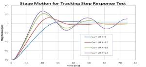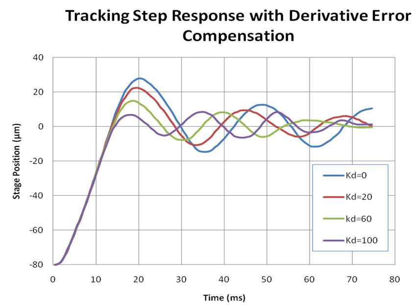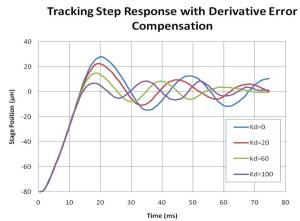 The chart above starts with the high-gain case with LR X=22 and then adds increasing amounts of derivative feedback. Notice that the initial rise time of the motion remains unchanged and rapid, consistent with the high gain value used. Increasing amounts of the derivative term reduce the level of overshoot and also increase the natural frequency response of the system.