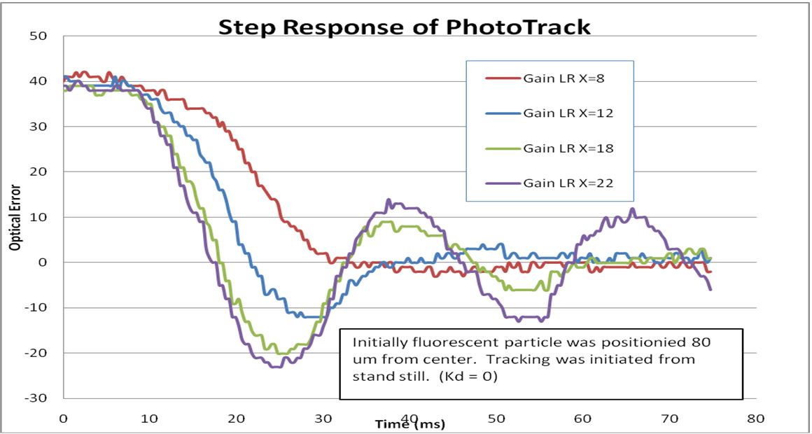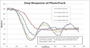 The following step response performance tests were done using a stage with 12.7mm pitch lead screws (top speed 13mm/sec) on a RAMM /MIM system. The target objects were auto-fluorescent pollen grains, imaged with a 40X objective in epi-fluorescence mode. Typical tests involved first locking onto a fluorescent particle, then setting the coordinates of the locked system to 0,0,0. Then the system was unlocked, and moved a fixed distance from center – in most cases 80µm to the edge of the camera FOV. Buffers were cleared, then the LK command entered to activate tracking. The system immediately moves the stage to center the object. The optical error signals and position information is saved in the DU buffer so the dynamics of the process can be observed.