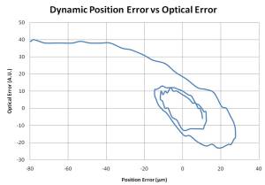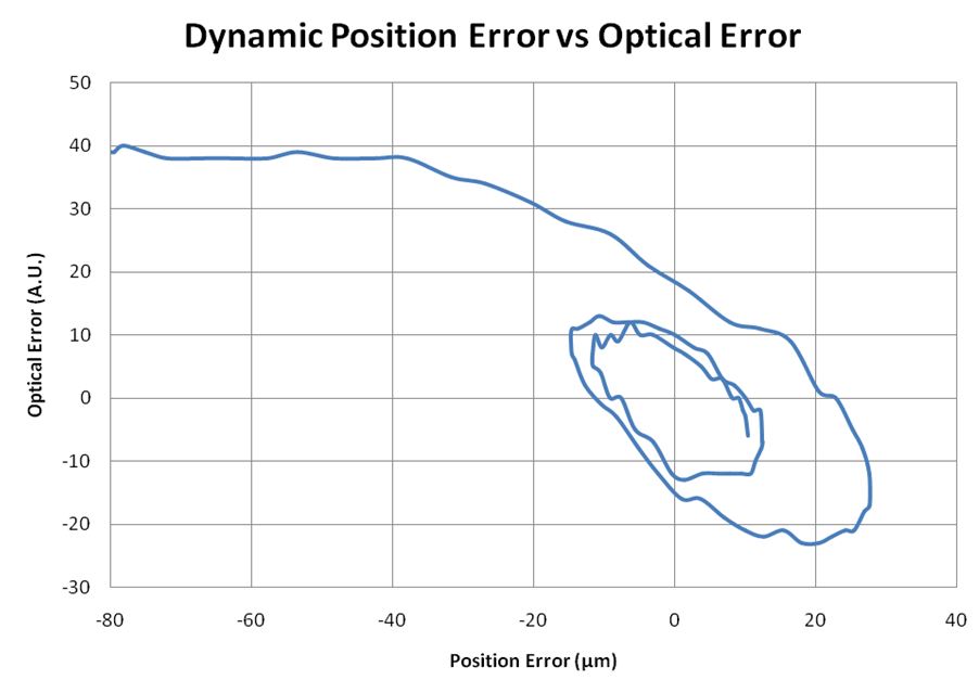 The data show the stage position and optical error dynamics as the stage is pulled to position. One of the major dynamic parameters is the overall gain of the closed loop system. That parameters is set with the LR X=n command. The data show results for various gain values. Lower gain is characterized by slower stage movement in response to the optical error. Higher gain is characterized by significant overshoot. For a feedback system, any delay in the error sensing signal path will significantly limit the frequency response of the total system. A careful analysis of the position record and the optical error record indicates that there is approximately a 3.5ms delay in the optical feedback collection path. This delay is due primarily to signal integration in the PMT (2.2ms), averaging of the digitized signal (0.3 ms), and controller processing latency (0.6ms). The phasing problem associated with this delay becomes clear when the stage position is plotted against the optical error signal, below for the high gain case where the oscillations of the two signals become a spiral toward the origin.