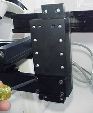 The figure above shows a typical installation. The spotting scope consists of a simple right-angle microscope body attached to a dovetail slide and focusing actuator. The entire apparatus is attached to the ASI XY stage. The figures below illustrate the installation procedure.