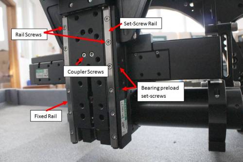 - Move stage plate to other end of travel and tighten remaining Rails Screws that are now supported by the bearings and stage plate. Tighten firmly but not to full torque spec.