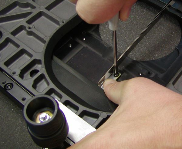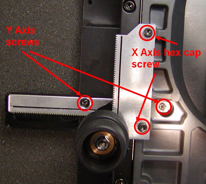 Step 1: Stage rack and gears can sometimes fall out of adjustment when a stage is shipped onsite. Start by removing the Piezo stage and invert it onto a foam pad. Find the XY adjustment knob and then locate the four rack mounting screws. Two of the screws are Phillips and two are 2.5mm hex head cap screws, as seen below.