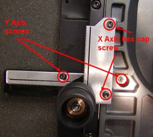 Step 6: Loosen the X-Axis cap screws and move the gear to the center of the rack. Push the gear into the rack from its center and tighten both screws. Check the left screw distance as in step 5 and compare it to the right one. Make the appropriate changes to make the right and left distance from the rack to the to the X-Axis stage plate the same for both and firmly tighten the cap screws.
