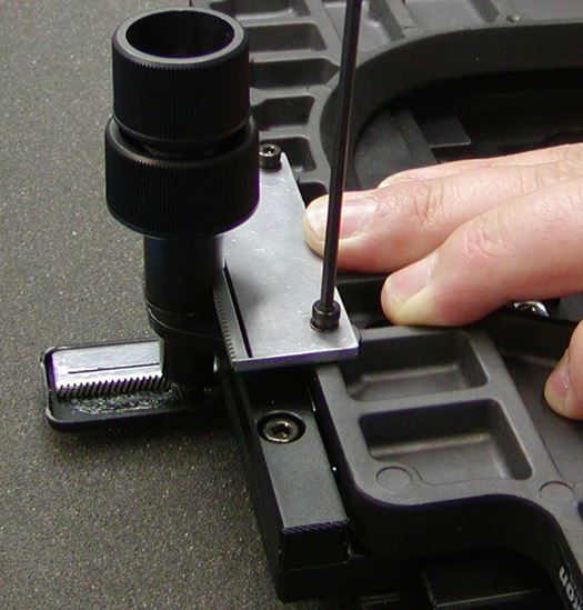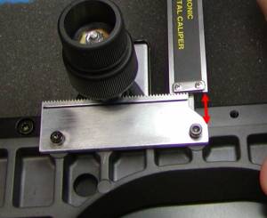 Step 7: Check the distances from step 5 to see if the rack is parallel. Also, check the motion of the x-Axis to see if it is firm enough between the rack and gear. There should be almost no play in the X-Axis plate when the X knob is held firmly. If there is still play in the X–Axis plate repeat step 6. The important point of the alignment of this rack is to keep it parallel to the stage plate and firmly engaged in the teeth of the gear.