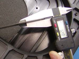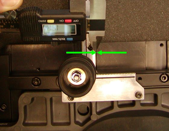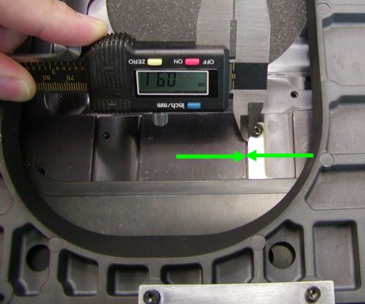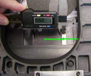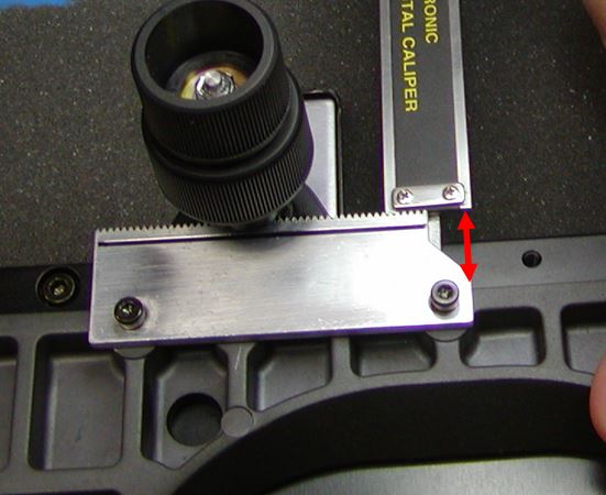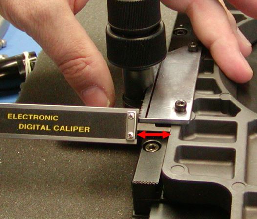 Step 2: To tighten the Y-axis first use the caliper to measure the distance from the back of the rack to the stage near each screw, as seen below.