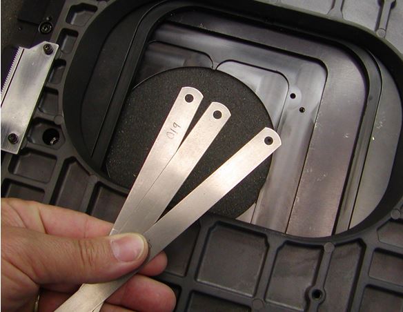 Be sure the power is off and the Stage is removed from the Microscope. You will also need a Phillips screwdriver, a 2.5 mm hex ball driver, a Caliper, an assortment of short shim stock or thin metal, and a foam pad a big as the stage.