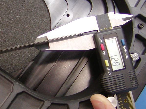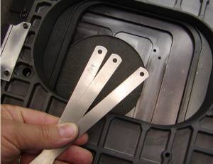 Step 3: Gather enough shim stock or thin metal stock to create a spacer that is larger than the gap measured in step 2 by .005 to.010”. Check the thickness with the caliper. Align the stage so that the screw can be seen through the bottom plate of the stage as seen in step 1. Loosen the Y-axis stage screws without removing them. Slip the spacers in behind each screw and tighten the screw back while pressing in the middle of the rack.