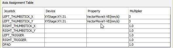 A common use of these controls is to move a stage. For this assign the axis to a stage's vector move property. In the case of an ASI's XYstage the property “VectorMoveX-VE(mm/s)” and “VectorMoveY-VE(mm/s)” are appropriate. They accept input in mm/sec and typical max value for the property is 4-5mm/sec. So here the multiplier column comes handy, when a multiplier of 3 is picked. Then the thumbstick deflection which varies from +1 to -1 , turns into +3 to -3 , and when applied to the device property , the stage will move +3 mm/sec to -3 mm/sec.