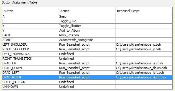 Unlike the axes controls, buttons have only two states, pressed or unpressed. The Action column of the Button assignment table lets user pick from a list of predefined actions (like Snap, Live view toggle etc) or “Run_Beanshell_script” to specify a beanshell script to be run on the button press. The path to the script is specified with the 3rd column. Clicking on it displays a File Chooser dialog box and user can navigate and pick the script to run.