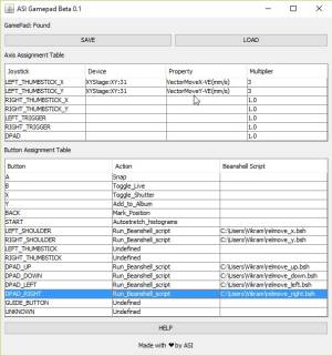 ASI Gamepad is a Micro-Manager plugin that adds support for an XBox Gamepad. It lets users assign device properties to thumb sticks and Beanshell scripts to button presses. It is part of Micro-Manager 1.4.x builds as of 24-Oct-2018 and can be found in the menu Plugins > Device Control > ASI Gamepad. To our knowledge it has not yet been ported to MM 2.0; any help doing so would be greatly appreciated.