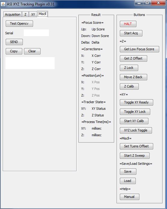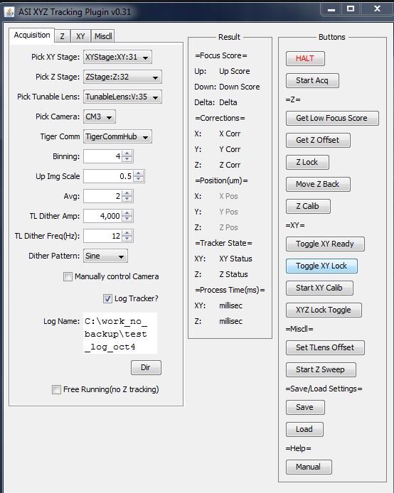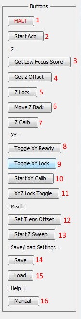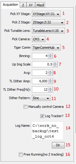 2) Start Acq, Starts Acquisition of images. Puts Camera in TTL mode, and sets Tunable Lens to dither with TTL out. Button then changes state to Stop Acq. When pressed shuts down acquisition and return all Trackers to idle state and stop any XYZ stage travel.