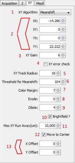 2) XX, XY, YX, YY are coefficients used by the XY Tracker to figure out the orientation of the camera to the XY stage. This setting is automatically determined by the XY Calibration routine, which is initiated by pressing the Start XY Calib.
