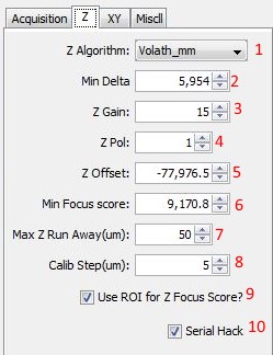 10) Serial Hack, when checked Plugin will leverage a new serial command on Tiger Controller to keep serial traffic to a minimum. Will only work on ASI systems with updated firmware (3.18+). If using a 3rd party system or older ASI firmware, leave unchecked.