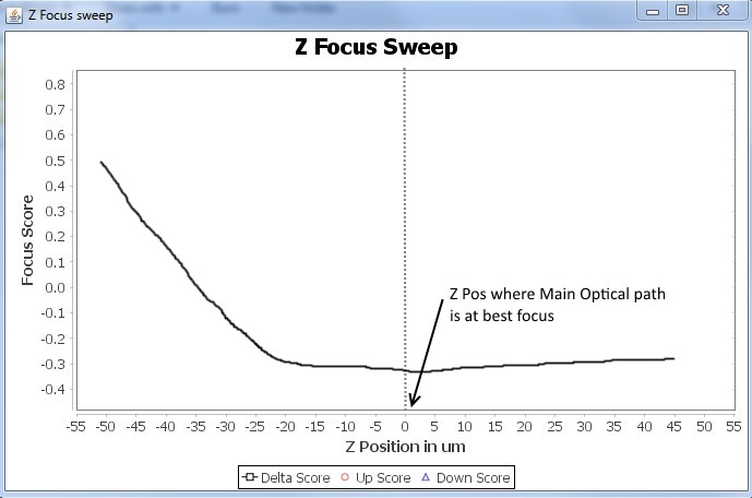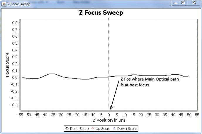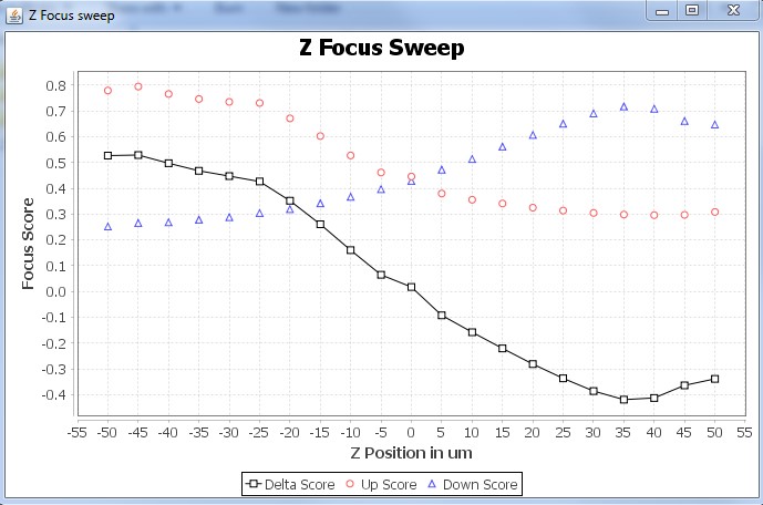 • Let's test the system by running the “Start Z Sweep” routine. Plugin then scans thru the sample with Z stage in 20 steps with the step size specified in “Calib Step (um)”. Say the Z position was 0um, and step size was 5um. Plugin moves the Z stage from -50um to +50um in 20 steps, of 5ums each. It records the Focus score of the up image and down image, and computes a delta of these scores and graphs them. A graph like the one below is generated.