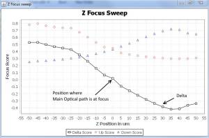 13) Start Z Sweep, does a series of twenty Z moves with 5um set size, and prints the UP, DOWN image focus score, and delta into a test box at the end of each move. It also generates a graph like the one shown below. It helps troubleshoot and adjust the Z tracker. The step size for the Z sweep can be adjusted with “Calib Step” setting in “Z tab”