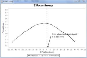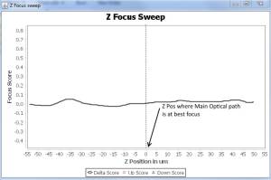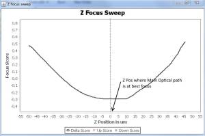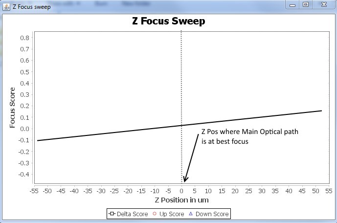 Above graph is ideal , we like a nice slope (either sloping left or right), with it centered as close to the main optical path's best focus as possible. When there is a shift in main optical path's focus, we are picking up change in up and down images focus score, and we know the amount and direction the Z stage needs to be moved to bring back to original focus.