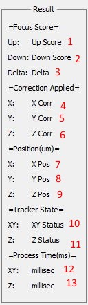 12, 13) Process Time (ms), shows how much time the Plugin is taking processing the frame. XY indicates the pixel shift processing time; Z shows the focus scoring time.