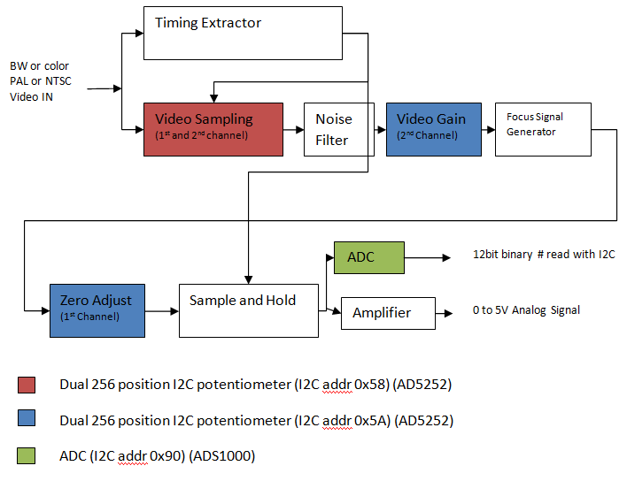 • Various I2C chips lets the user set the cards internal settings like subset of video to be processed , gains and zero adjusts of internal circuitry and also to read the focus signal .