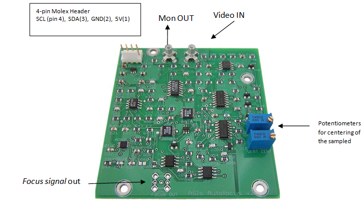 The ASI auto-focus system is an electronic circuit that detects the high spatial frequency information present in a video signal coming from an analog camera, and converts it to a focus signal for each frame – the better the focus, the larger the focus signal. The focus signal has amplitude between 0 to 5 Volts. An onboard ADC is provided; lets the user read the focus signal as an 12bit binary number with an I2C interface. Depending on the sample and the type and power of the objective, the conditions to achieve the best focus signal may change. To compensate, the system incorporates a set of I2C controlled digital potentiometers that lets the user calibrate various internal parameters to get a good focus signal. The system also allows user to highlight any subset of the video field and generate focus signal for it.