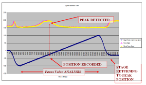 A slight improvement of this routine is “Hill Detect“ routine. In this routine, the auto-focus controller watches for the focus signal to increase in value and then when it starts to decrease, a hill is detected. At this point, the auto-focus controller stops the scan and goes back to the position that had the highest focus value found on the hill. This is somewhat subject to false focusing and should be used only on high contrast single-layer samples.
