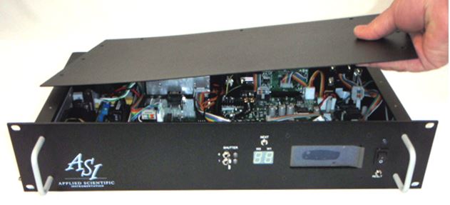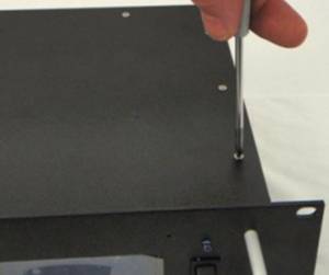 First, using the Phillips screw driver, remove the nine lid screws that attach the top of the rack controller, (see picture above). Three are on the left, three on the right and three in the middle, (see pictures below).