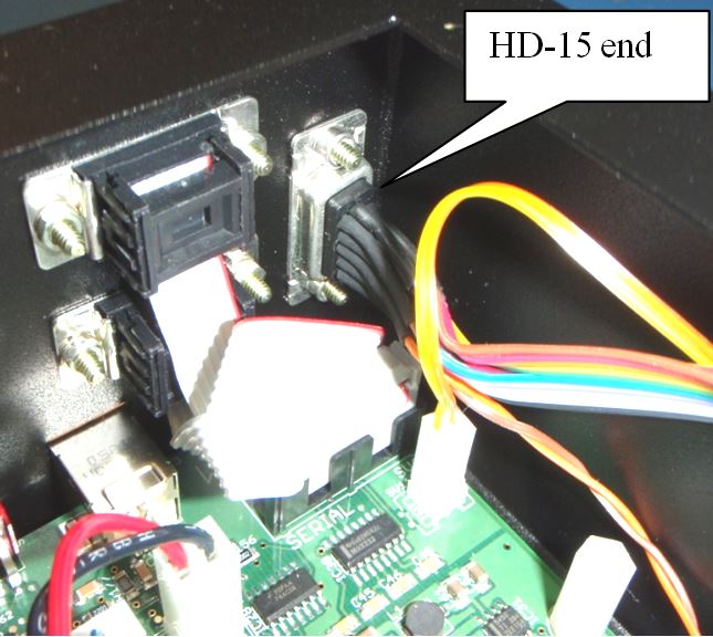 Third remove the jack screws and lock washers and nuts that retain the HD-15 joystick ribbon header and set them and the header aside. The new header only needs the jackscrews to reattach to the back of the case and the other ends at the Mother Board are just pushed in to the same positions they were removed from
