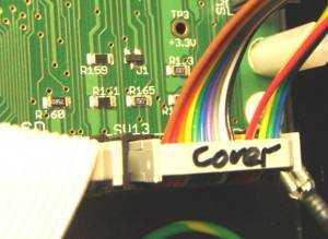 The header connects to the S-13 “COVER” header on the front right of the Mother Board, and some units also have a two wire pigtail going to the SV-5 header or the SV-6 header, (just above the microprocessor for the former and to the left of the microprocessor for the latter). Some rack units will require that you chisel an epoxy seal off the cover headers and board connectors to remove them and others have zip ties that must be cut. If the unit you have is glued remove the glue with the flat head screw driver but be careful not to damage the board or the cables or yourself. Remove the joypod to board headers.