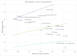 Chromatic aberrations are rooted in dispersion, which describes how the exact RI changes with wavelength (commonly reported as the Abbe number). For a specific medium the dispersion can be corrected, but since these objectives are designed to work in many media it cannot be perfectly corrected for all of them. Chromatic correction could have been improved with a correction collar; this was deemed to add too much complexity for the corresponding benefit. Hence, during the design we can only optimize the chromatic correction for one media, but TDE and CLARITY/Focus Clear are very well corrected for simultaneously. The middle dotted line on the plot below shows the approximate correction line used for 54-10-12 and 54-12-8, whereas the bottom line going through methyl salicylate was chosen for the 57-12-19 (i.e. emphasizing organic solvents).