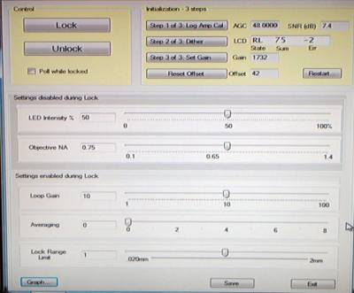 1)Click Step 2 “Dither” state. Adjust the main CRISP adjusting Thumb Screw for maximum ERR number. 2)Click Step 3 “Set Gain” and wait a few seconds for it to finish. 3)Re-focus microscope on sample and set the Z-axis controller position to Zero. (HERE Z=0) 4)Be sure NA setting is correct for the objective and click “GRAPH” button.