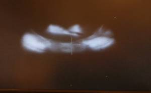 If you focus the microscope higher or lower, Figure 2 & 3, the mask image morphs into a blur. In one direction, the LED die comes into focus. When the splitting mirror is correctly adjusted, the bulk of the light will translate laterally (vertically in the photos).