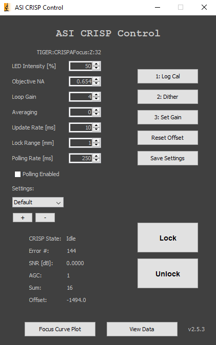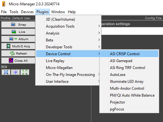 Micro-Manager Main Window > Plugins > Device Control > ASI CRISP Control
