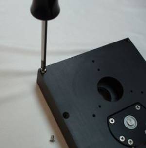 Now that the wheel is centered, replace the wheel body into the case in reverse order. The button head screws that hold the four corners of the body must be completely hand tightened and then turned back ½ turn to allow the felt to absorb vibrations. Finally, repeat part 9 above and check that the wheel is still centered upon power up.