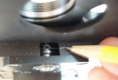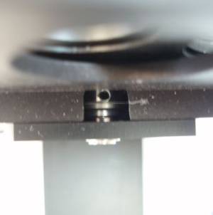Step 4: Locate and mark the position of the filter wheel Optical encoder disk with a pencil next to its opening. Next, rotate the wheel manually until the .050” set screw is visible from the opening.