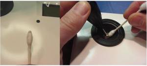 Step 2: Place a small amount, (appx. 2mm sq. volume), of the lubricant onto a cotton swab. Move the joystick to the far left and lubricate the exposed part of the ball with the swab. Repeat this process for the right, up, and down directions.
