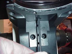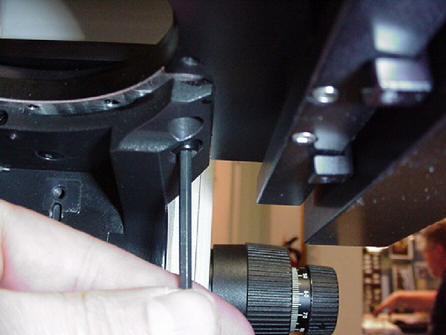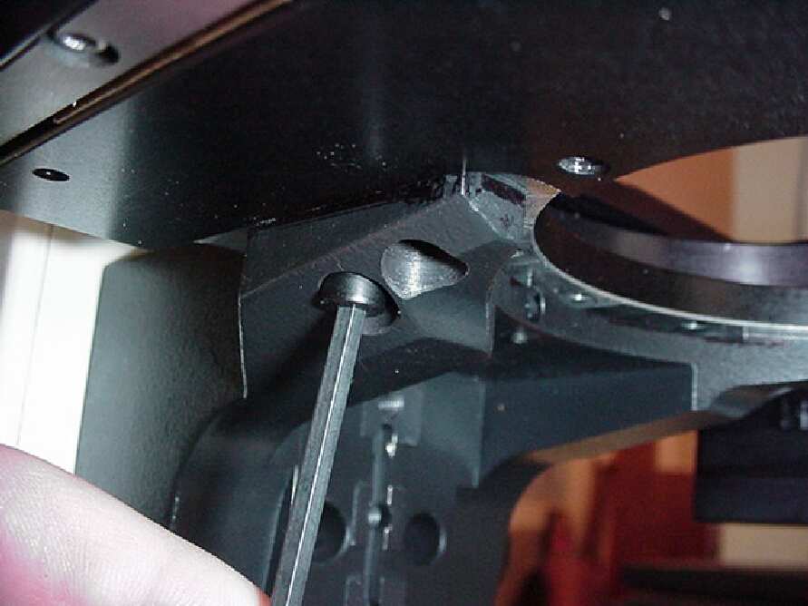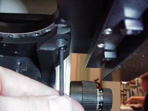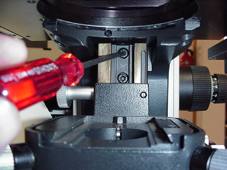 To gain access to the 3 ea. 4x8mm screws that secure the original mechanical xy stage the condenser carrier must be removed. Remove the condenser as outlined in your microscope's manual & rack the carrier all the way down as shown. Use a 3mm Allen wrench as shown in figure # 1 to loosen the two screws that secure the carrier to the microscope.