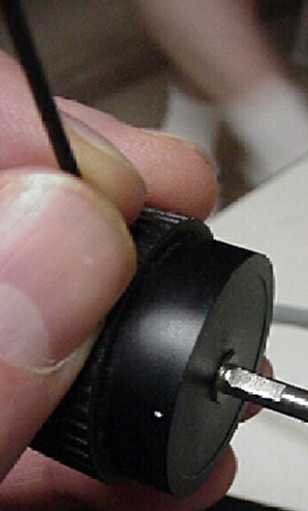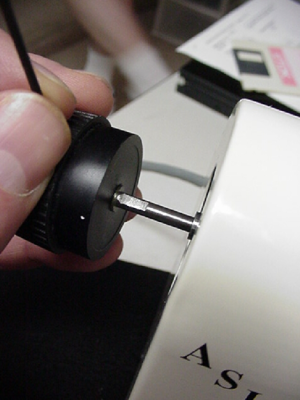 1) Remove the left fine focus knob by using the 1.5mm hex wrench to loosen the set screw as shown above in figure 1. Then pull the knob off of the fine focus shaft as shown in figure 2.