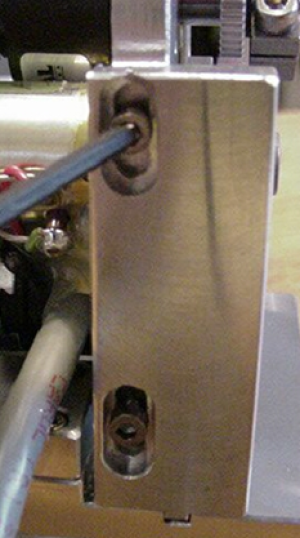 Locate the motor drive and the back plate. If the drive is not installed onto the back plate, install it as shown in figure 3. Do not completely tighten the horizontal adjustment screw shown in figure 3. Leave it loose enough so that the drive can easily slide within the grove. Also loosen the vertical adjustment screws shown in figure 4 so that the drive can easily slide within the grove. At this time, also loosen the screw on the fine focus shaft clamp that is located near the black encoder. This clamp is showed installed in figure 5.