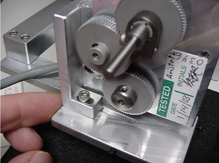 Remove the two screws from the edges of the drive assembly as shown in figure 12. Locate the ASI cover plate. Place it in position over the motor drive assembly, as shown in figure 13, and secure it with the screws just removed. Place the left fine focus knob over the protruding end of the drive shaft, as shown in figure 14, and secure it in place with the 1.5 mm Allen wrench. Please note that the set screw needs to mate with the flat part of the shaft as shown in figure 14 to prevent the fine focus knob from slipping.