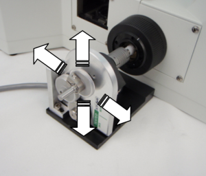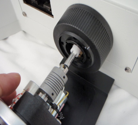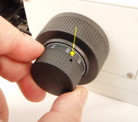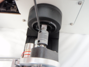 c) Holding the fine knob on the left side of the microscope, carefully slide the flex shaft coupler over the fine focus post.