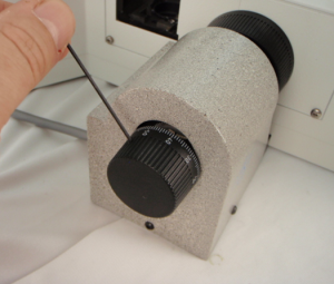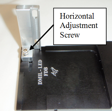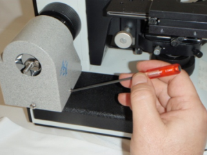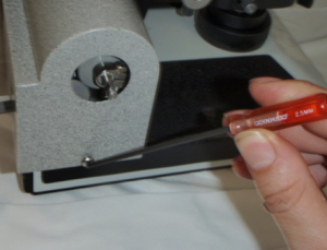 c) Using a 1.5mm Allen wrench lightly tighten the adjustment bar set screw (figure 2c), on the right side of the microscope, so that it holds onto the microscope - but can still be moved around to adjust position for proper alignment.