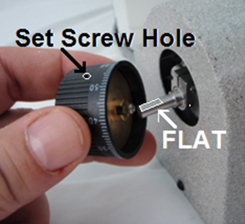 d) Lining up the set screw hole with the flat spot on the fine focus extension shaft, slide the microscope fine focus knob over the Z-Drive shaft extension and press it on all the way (figure 5d). Note: You may have to loosen the set screw to get the knob to slide on all the way.