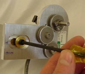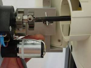 e) Use the 3/32 Allen wrench to loosen the screw that clamps the motor in place. Once the motor is loose rotate motor clockwise to engage the rubber wheel with the filter turret as shown in figure 8. Tighten the screw to hold the motor in place