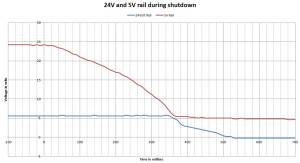 Above is an example of the voltage rails behavior in an ASI system. 5V is derived from 24V rails , and so the 5V rails doesn't decay until 24V rails decays to 5V. In our system , this gives us about 300-360millisec delay between the two rails.